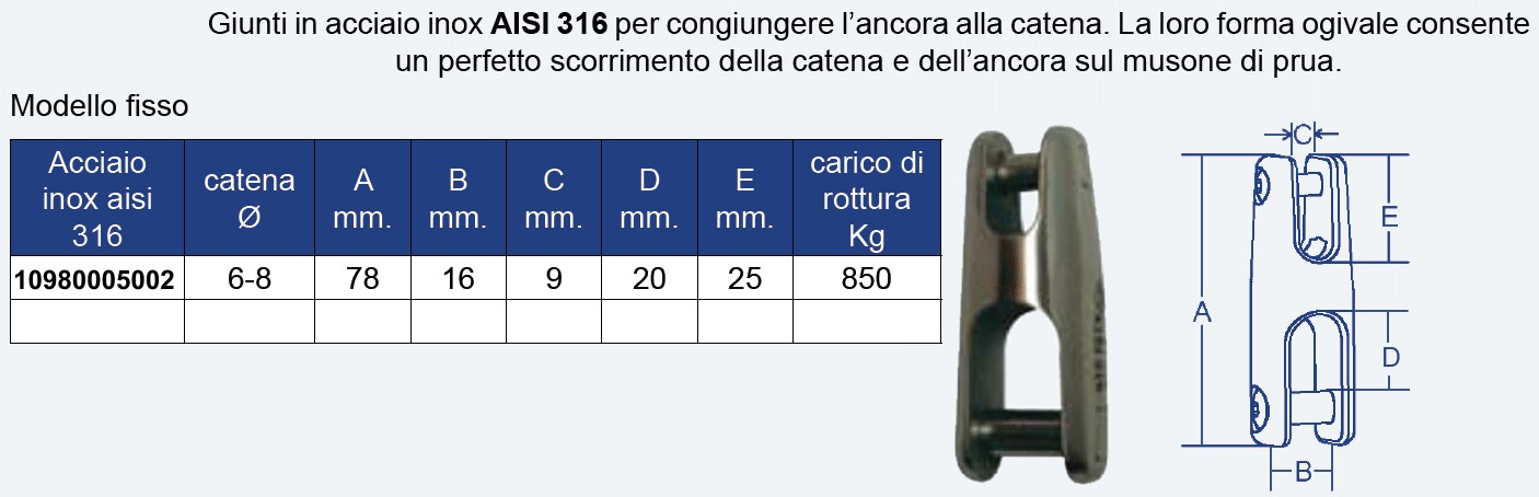 Giunto fisso acciaio inox AISI 316 per catene Ø 6-8 mm
